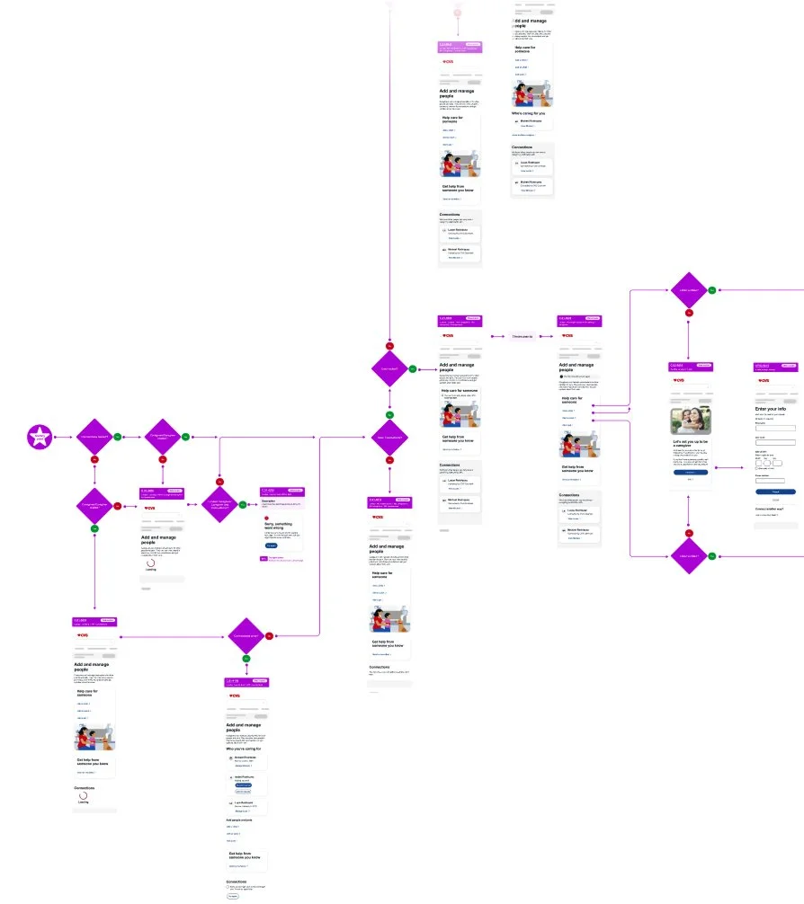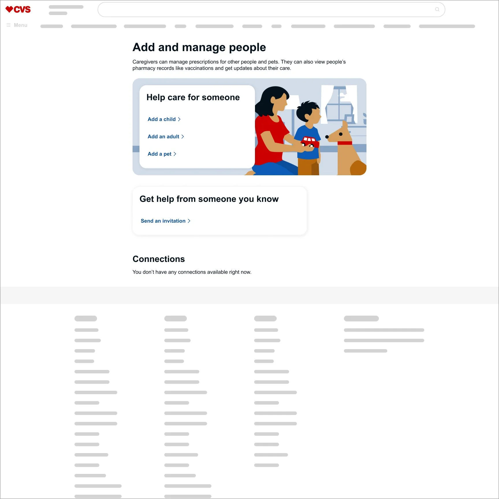 At LOA2 (Level of Assurance 2) authentication, CVS Health users unlock access to caregiver functionality, prescription refills, and health records. My focus was designing the flow to add a care recipient—ensuring lookup, consent, account relationships, enterprise access, and account linking were clear, secure, and easy to complete.
