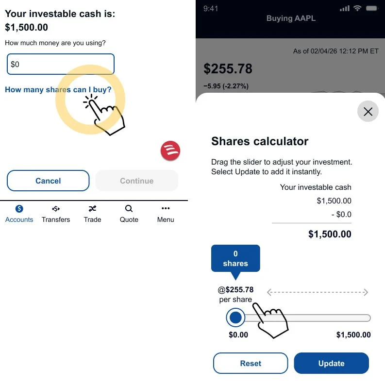 The interactive slider provides instant feedback and improves transparency—helping novices understand what changes when switching between amount and shares. However, testing feedback showed the modal-style interaction felt disruptive to the trade flow.