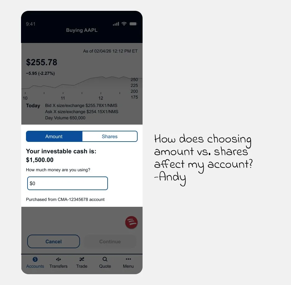 To improve the trading experience within the Merrill Edge app, stakeholders, UX designers, and developers collaborated in a workshop to reimagine the end-to-end trade flow.