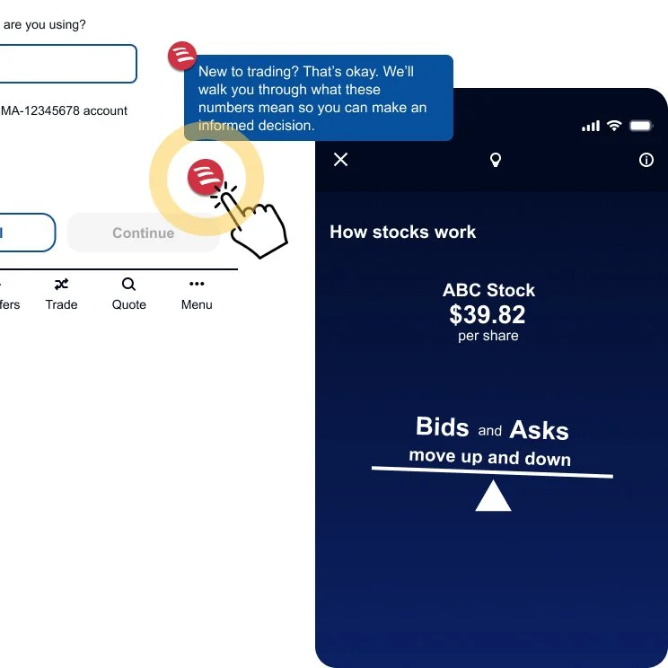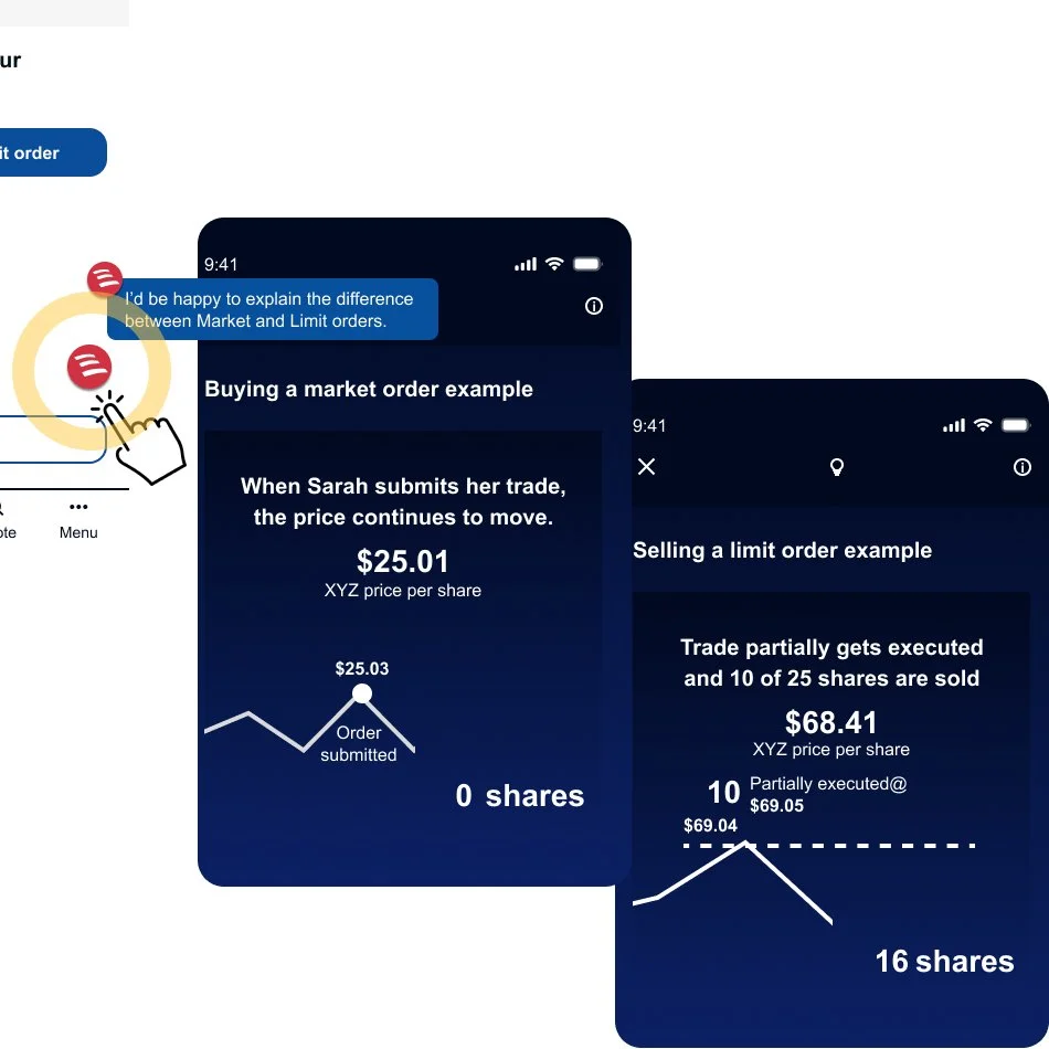 Tapping it launches Erica, delivering immediate, in-context guidance without interrupting the trade flow. Erica provides clear explanations and reassurance before users proceed.