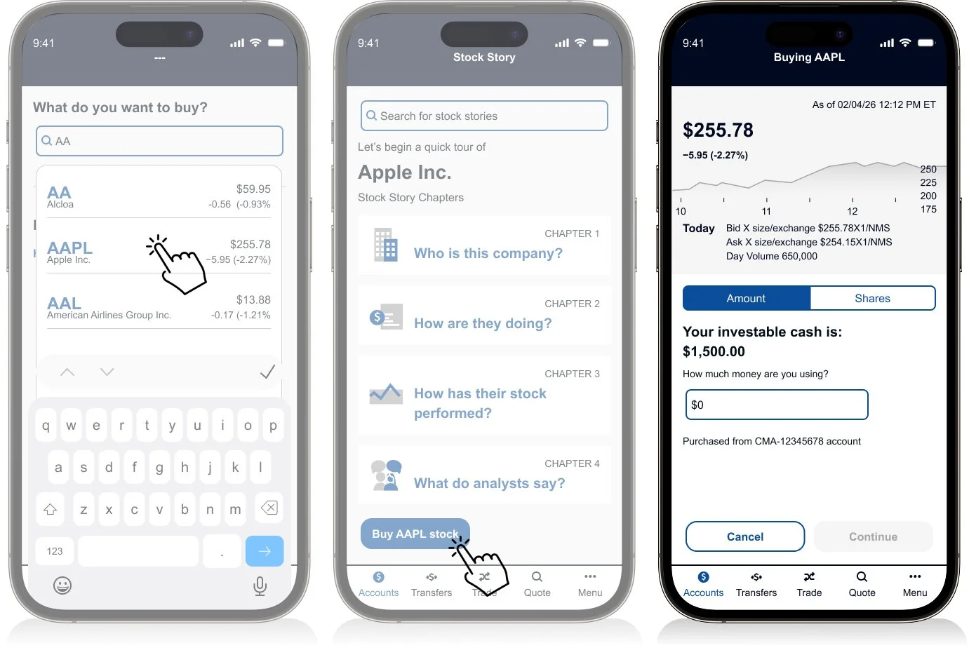 Andy selects AAPL and enters his purchase amount. He notices unfamiliar numbers beneath the stock price ($255.78) and the label “Bid × size/exchange,” which immediately creates uncertainty.